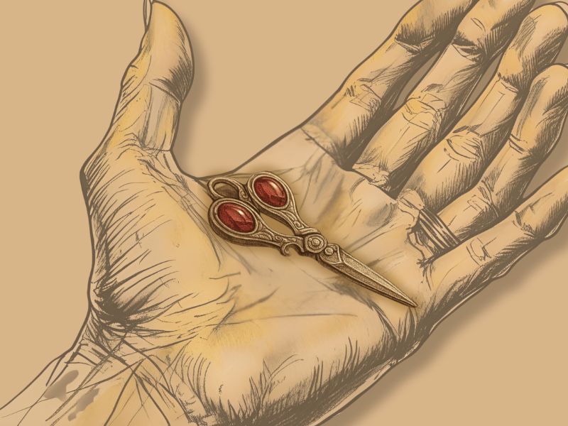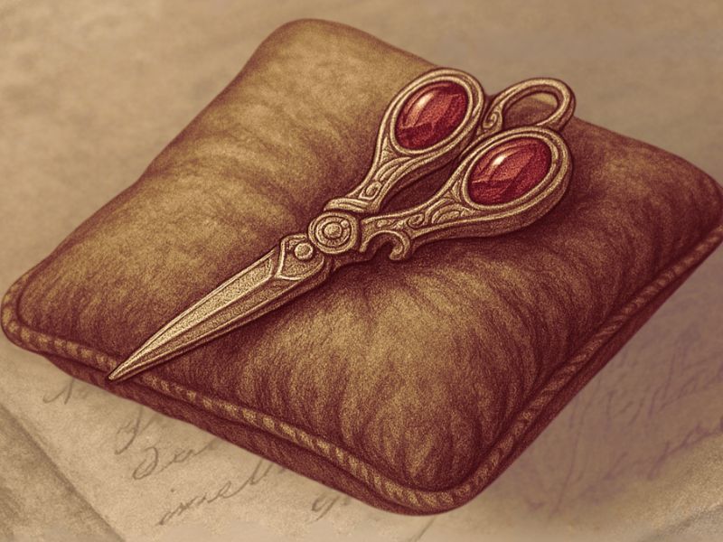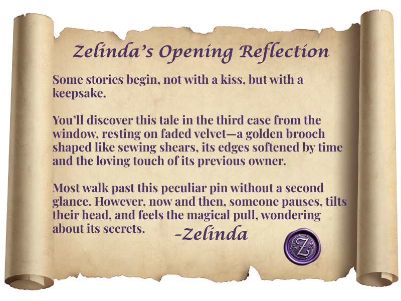 Zelinda’s fingertips brushed lightly over the gold, following the curved design, her touch almost reverent. The dim light of the shop reflected off the ruby-eyed shears, casting a faint crimson glow onto her fingertips. A faint smile tugged at the corners of Zelinda’s lips—a knowing smile, as if the brooch whispered something only she could hear.