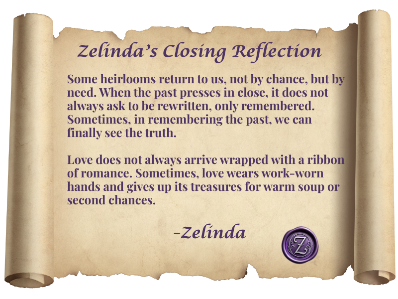 “Ah,” Zelinda murmured, her gray eyes narrowing as she tilted the brooch toward the light. “This pin has seen many lifetimes… far more than most would care to know.”